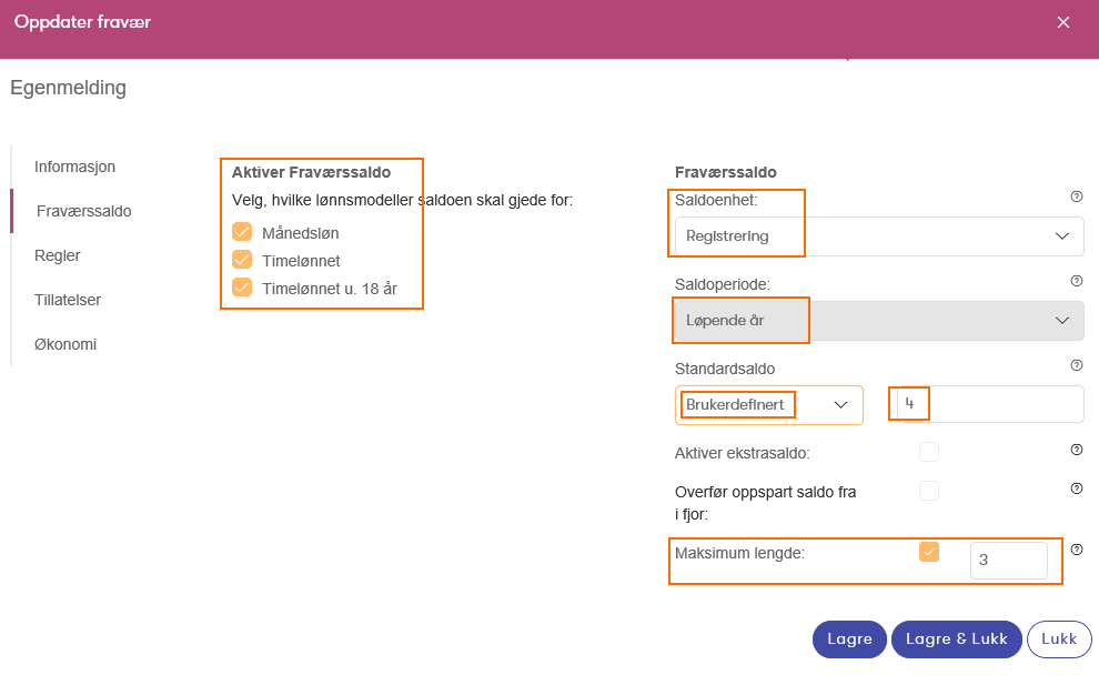 Innstillinger for saldo-beregning fraværstyper